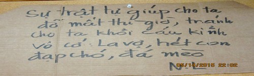 Ngày nay, đã vào tuổi 70, tôi vẫn còn giữ câu châm ngôn trong nhà để xe: "Sự trật tự giúp cho ta đỡ tốn thì giờ, tránh cho ta khỏi cáu kỉnh vô cớ, la vợ, hét con, đạp chó đá mèo…" Hy vọng là tôi không thái quá.
