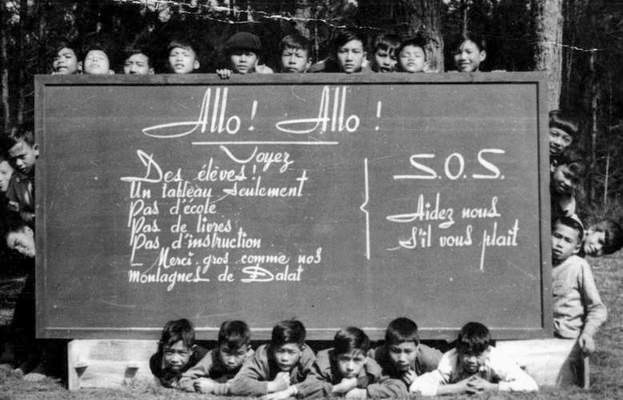 Allo ! Allo ! Voyez Des élèves ! Un tableau seulement Pas d’école Pas de livres Pas d’instruction Merci, gros comme nos montagnes de DaLat S.O.S. Aidez nous S’il vous plait”